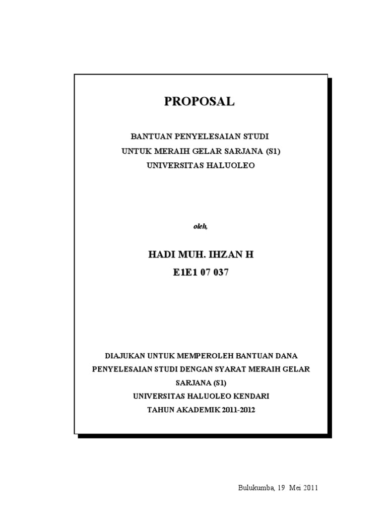 Contoh proposal penyelesaian studi. Hp PROPOSAL PERMOHONAN DANA BANTUAN PENYELESAIAN STUDI. Diajukan untuk memperoleh bantuan dana penyelesaian studi dengan syarat meraih gelar sarjana s1 universitas haluoleo kendari tahun akademik 2011-2012. Bantuan penyelesaian studi untuk meraih gelar sarjana s1 universitas haluoleo.